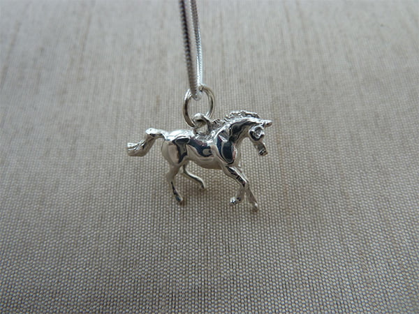 This lovely cantering pony pendant is sure to attract attention to whoever wears it. Comes on an 18 inch snake chain.