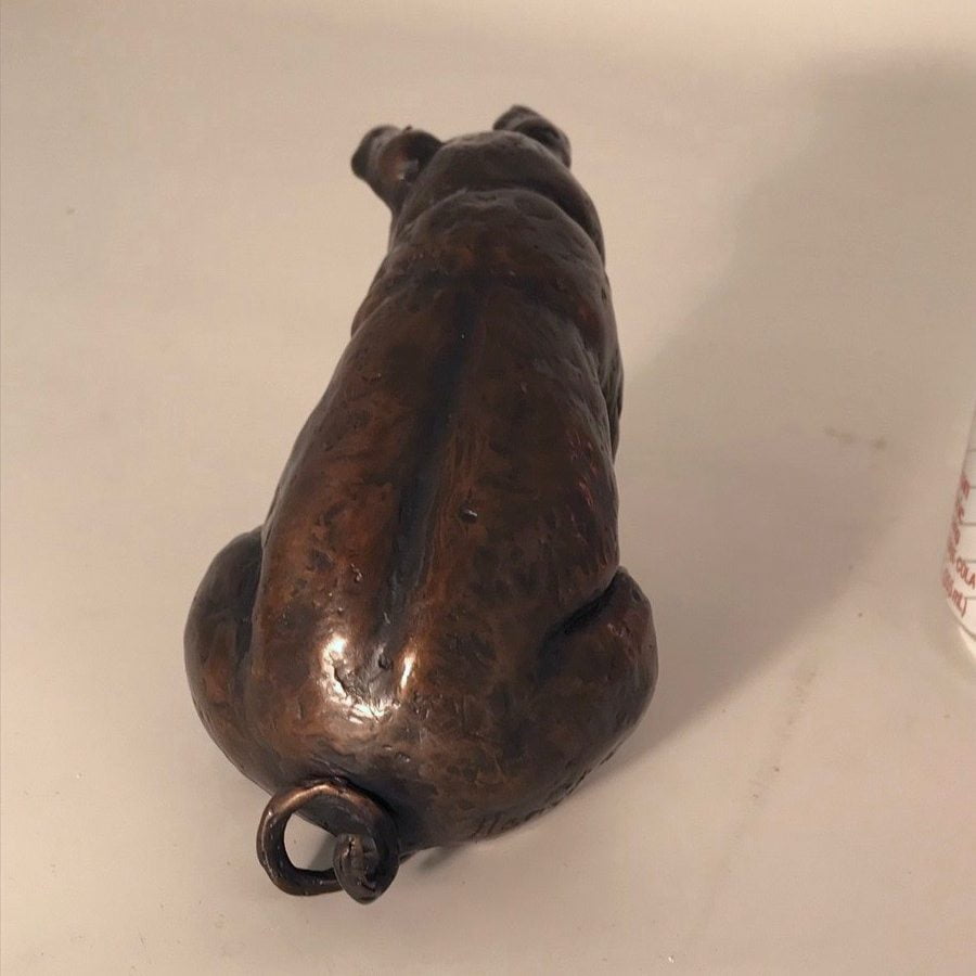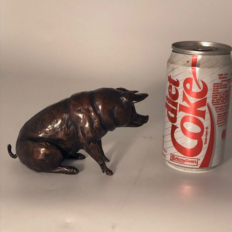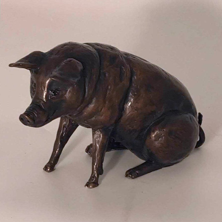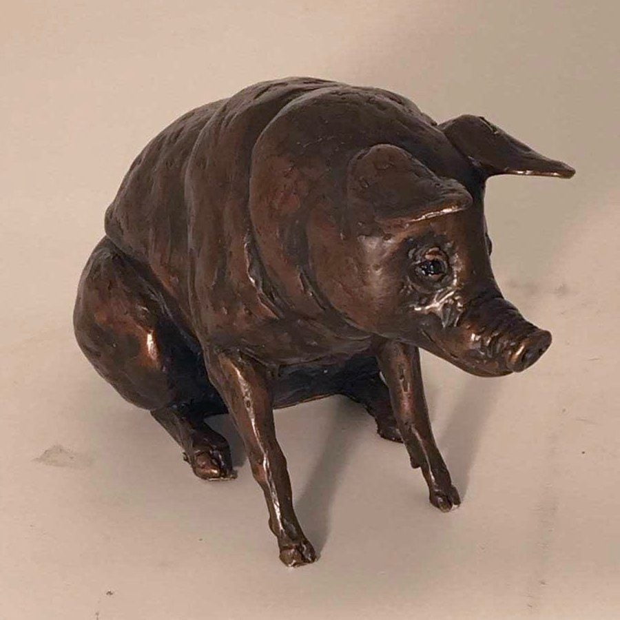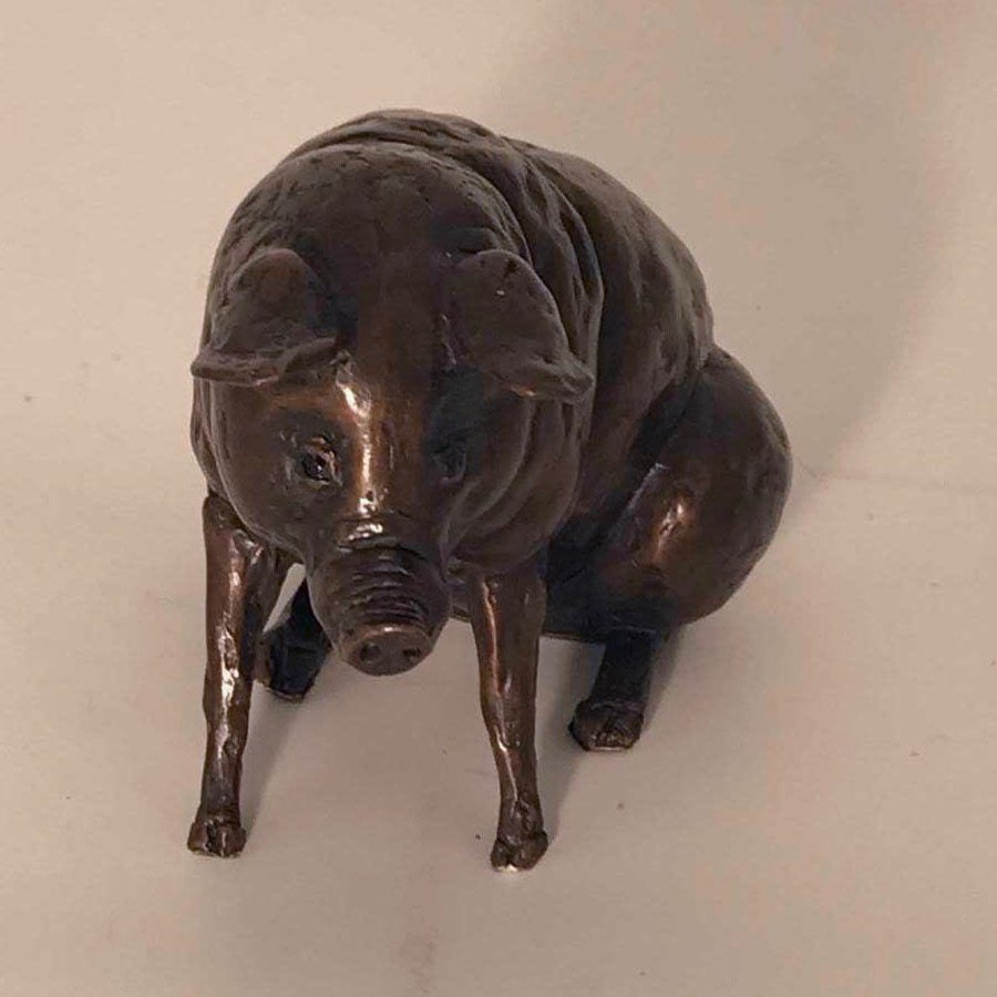 This is a happy bronze pig! She possibly sits in a wallow, enjoying outdoor life! She has a curly tail and an upturned snout. She is very tactile and fits comfortably into the hand, and has huge appeal to pig lovers all over the world!